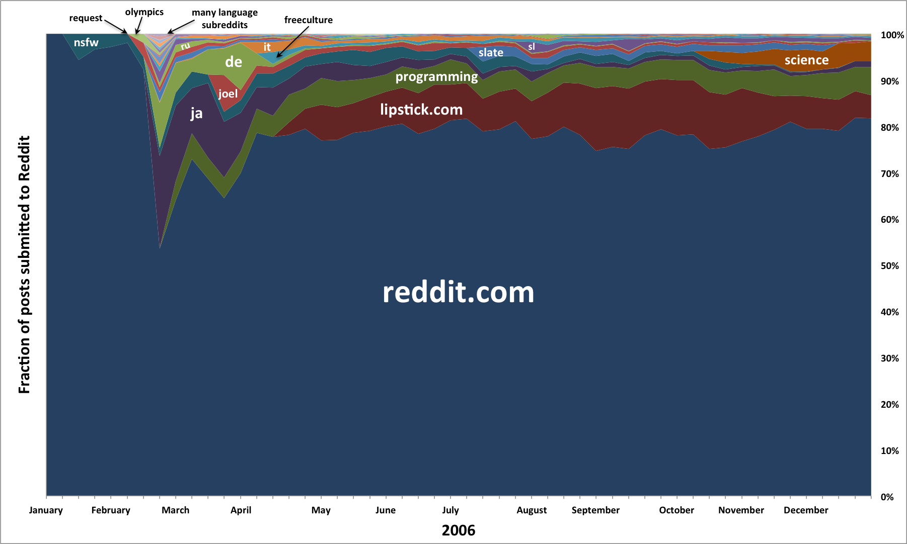 This year, we see an explosion in the diversity of subreddits. What the heck happened? As it turns out, Reddit added a feature for users to create their own subreddit. Almost immediately, people created /r/pics, /r/funny, /r/WTF, and many other subreddits dedicated to pictures. In just the matter of a few months, 1/3 of Reddit's content was sorted from /r/reddit.com into subreddits dedicated to specific topics. Thanks to the new "create your own subreddit" feature, Redditors were able to sort the majority of their own content out into the proper forums. The Reddit system works! Cool!