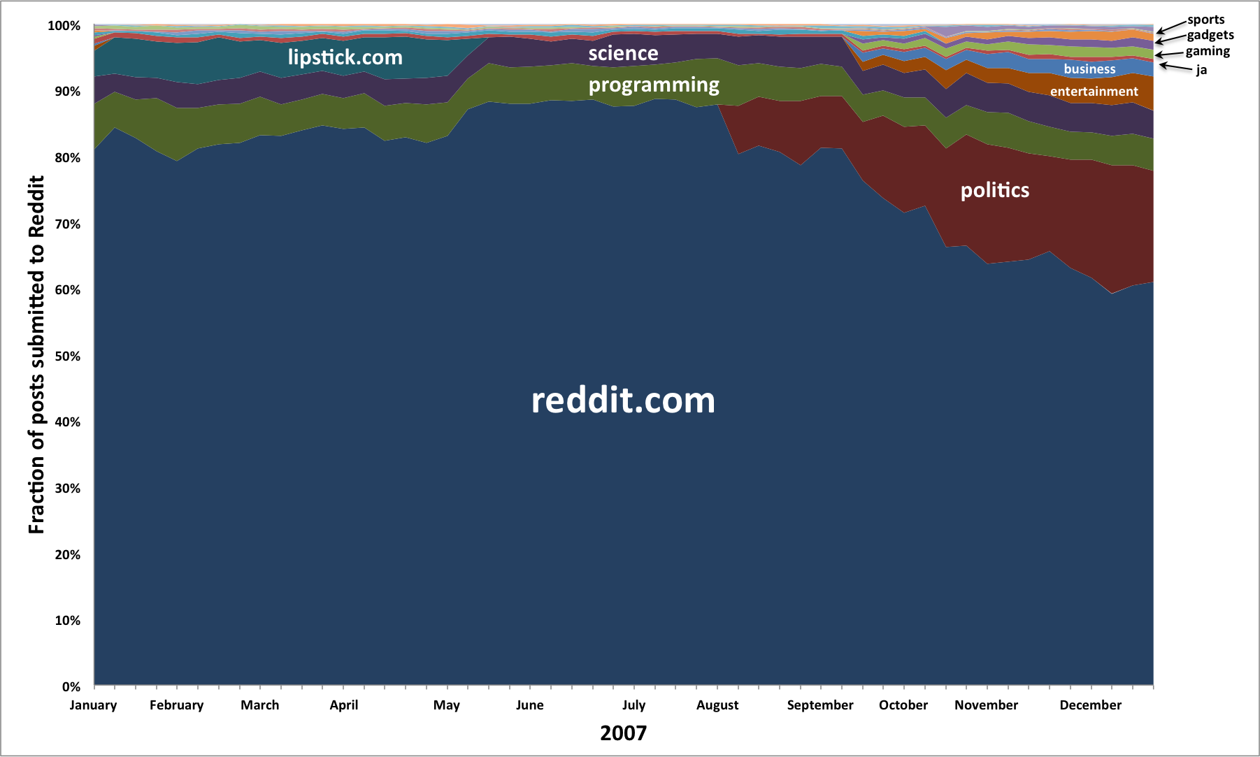 The biggest change in subreddits that we can see here is the explosive emergence of /r/politics. It seems like Redditors in 2007 were dying to have a politically oriented subreddit, seeing how the subreddit grew to take up 20% of the total submissions to Reddit in a matter of a few months. Sure enough, looking at the blogs again, we can confirm just that: /r/politics was an addition by popular demand. Redditors of 2007 were so politically-oriented that they had /r/obama created over a year before the election!