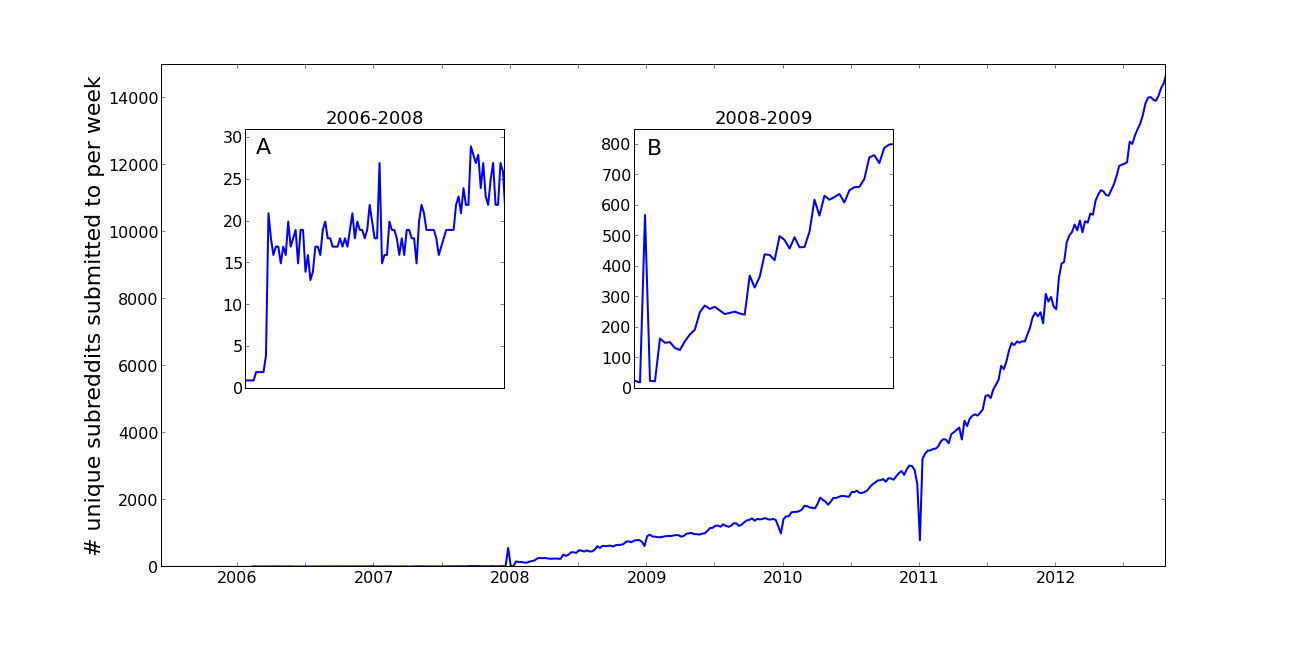 Panel A shows the very gradual increase in subreddits from 2006-2008 as Reddit's managers slowly added subreddits by request. Panel B shows the huge blip in the number of subreddits during the "create your own subreddit" beta period, then the crash when they ended the beta period, then finally the never-ending diversification of subreddits as Redditors were officially allowed to create their own subreddit. As of November 2012, there were as many as 14,000 different subreddits active at once, and I'm sure it's kept growing since then!