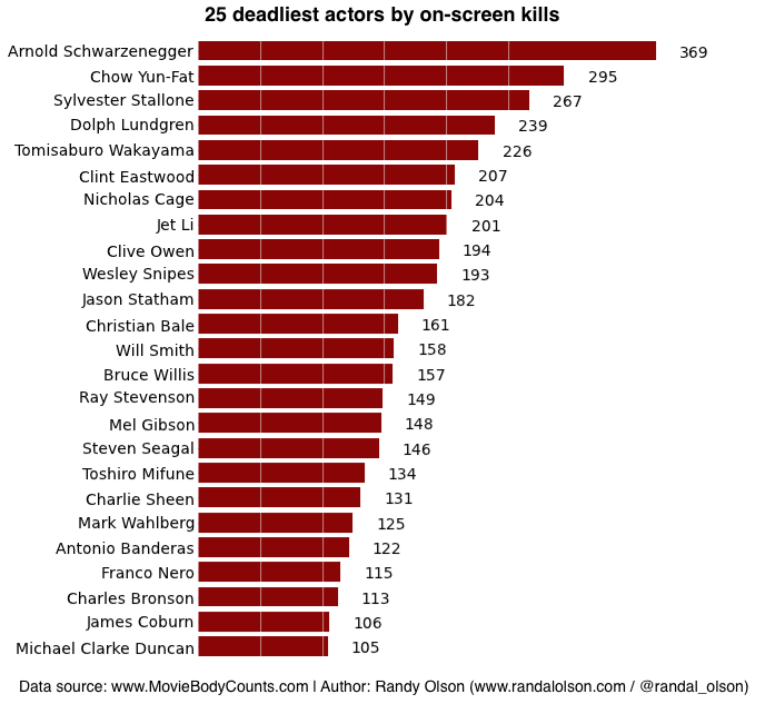 Below is the second in a series of visualizations I created, showing the top 25 deadliest actors by on-screen kill counts. If you would like to feature any of these visualizations on your own web site, please contact me first.