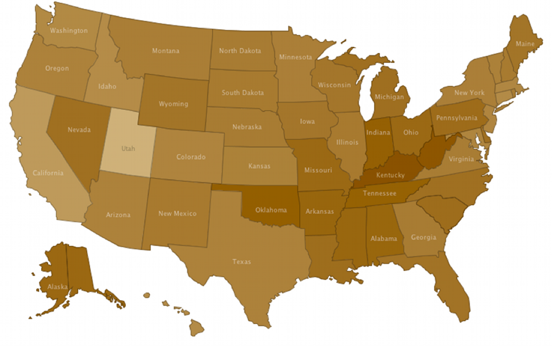 Color is one popular tool for making certain data stand out above the rest. When considering the map below, Kentucky and Utah (the darkest and the lightest) will most likely stand out to us first.