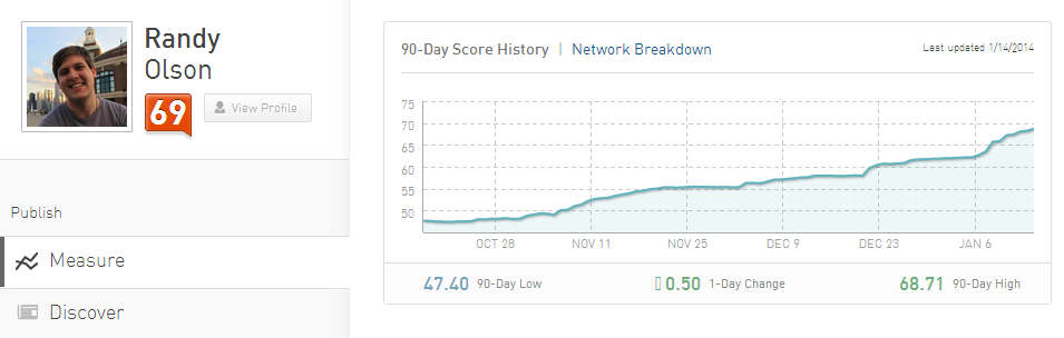 The Klout dashboard menu shows your Klout score over the past 90 days.