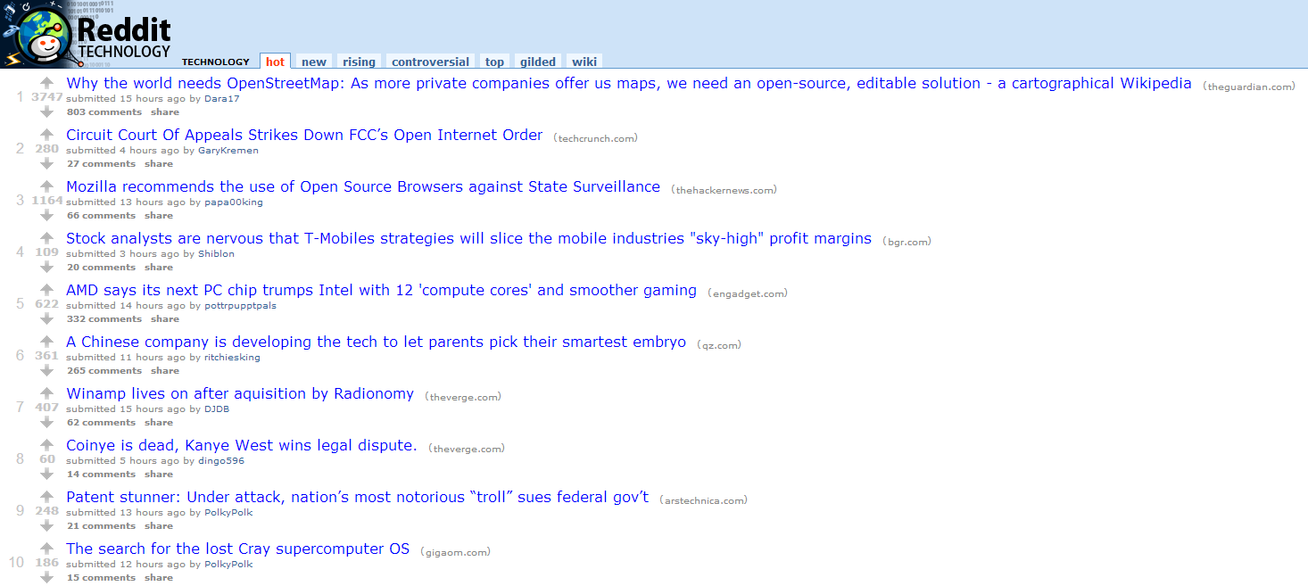 The top 10 popular links of the day on /r/Technology are a great source of articles if you want to appeal to a techie audience.