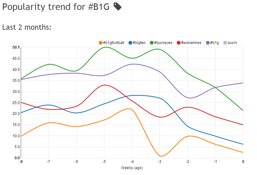 If we go back to Hashtagify.me and compare the Big Ten community's most influential hashtag's popularity over time, we make another great finding: #B1G is the only hashtag that hasn't been tanking in popularity since the end of the primary college football season. Now we know for sure that #B1G is the hashtag we should include in our tweets if we want to get the most attention from the Big Ten community on Twitter.
