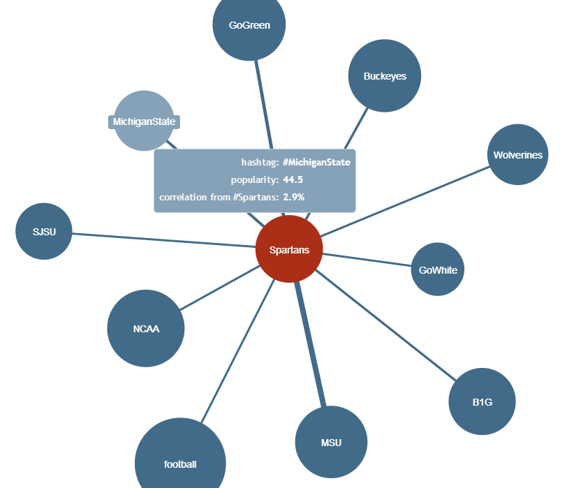 Another great feature about Hashtagify.me's hashtag network visualization is that is tells us how related each hashtag is to each other. In this case, "relatedness" is a measure of how often the hashtags are used together in the same tweet. If we again record all of these relatedness scores, we can produce a nice map of the Big Ten hashtag network. There are several different tools that we can use to visualize these kinds of networks, but I used Gephi in this case study because it's free, open source, and easy to use. See Gephi's tutorial on their data laboratory to find out how to input network data and visualize it in Gephi.