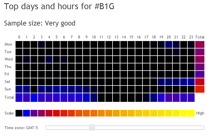 We see some fairly clear trends here: #B1G is used the most on Saturdays and Sundays in the mornings before 10am EST and in the evenings after 6pm EST. Although we could employ a strategy to tweet when fewer people are tweeting on the hashtag (between 11am and 5pm EST), most likely the people who follow #B1G will only check Twitter for it during the hours that it's normally used. As such, we should tweet when #B1G is used the most to connect with more users.