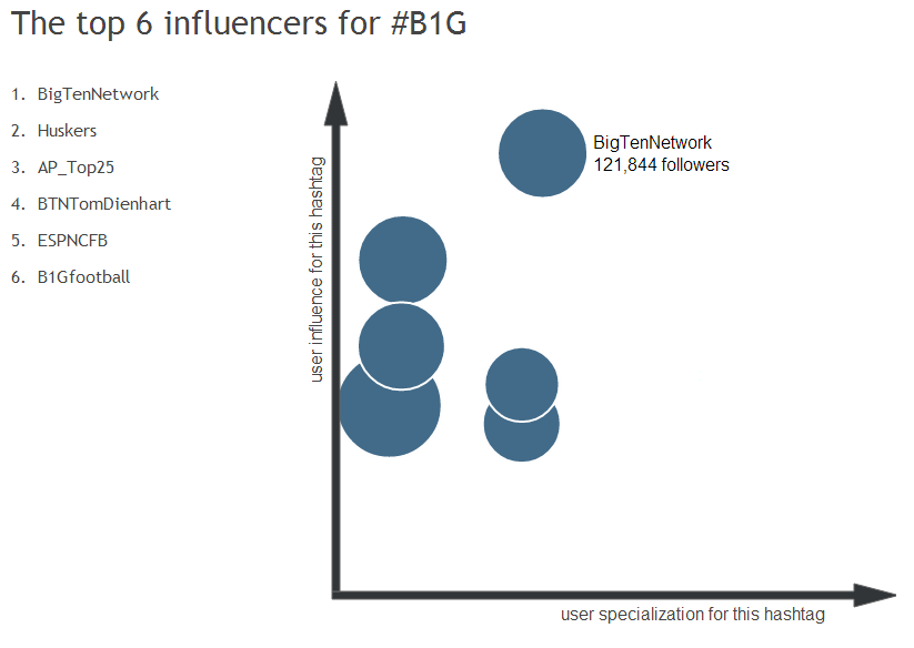 Fun fact: It's especially interesting to note here that some of the most popular hashtags in the Big Ten community, such as #Michigan, #Huskers, and #Badgers, have about the same influence in the community as the least popular hashtag, #B1GFootball. This just goes to show that even in online social networks, size isn't everything!