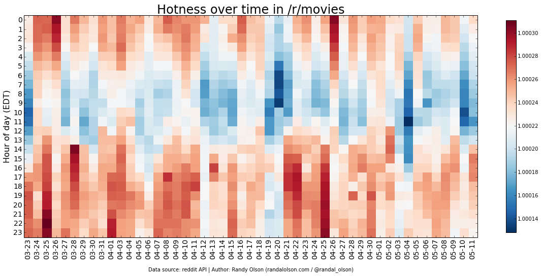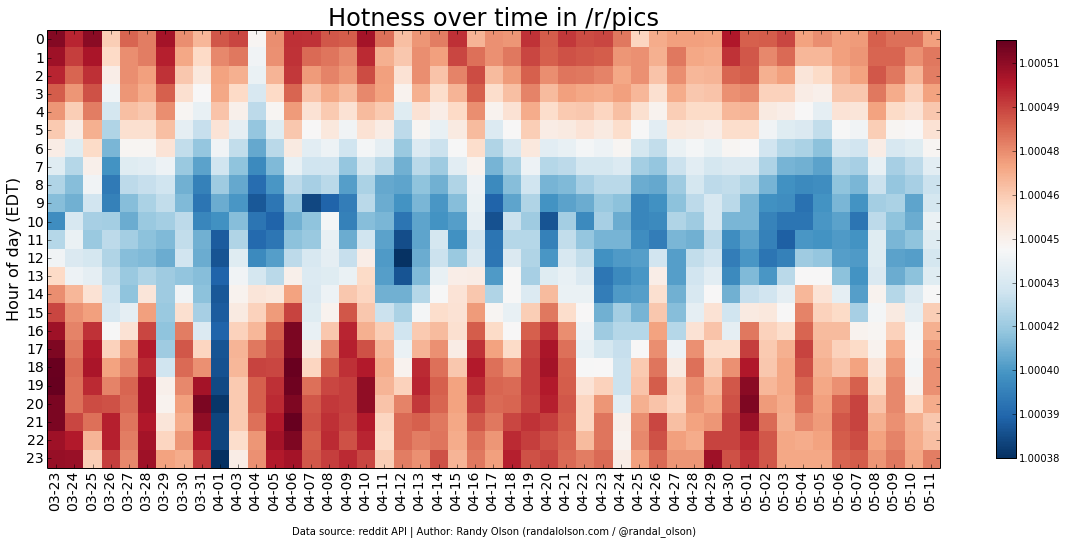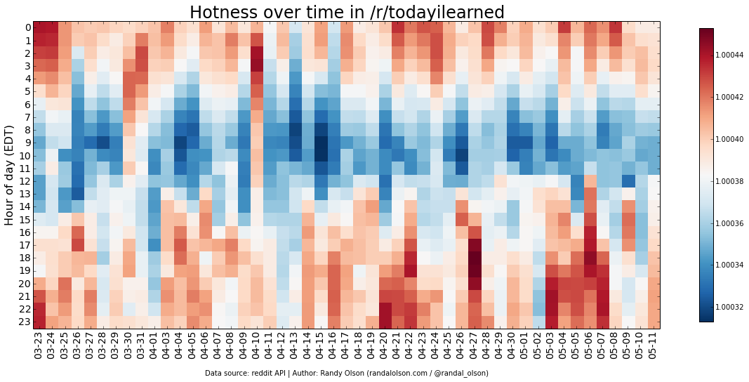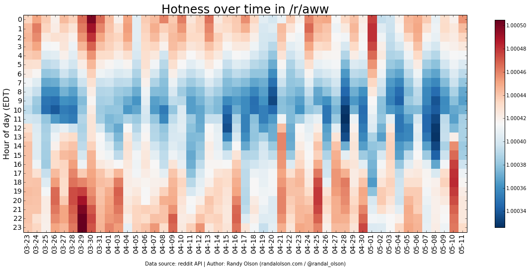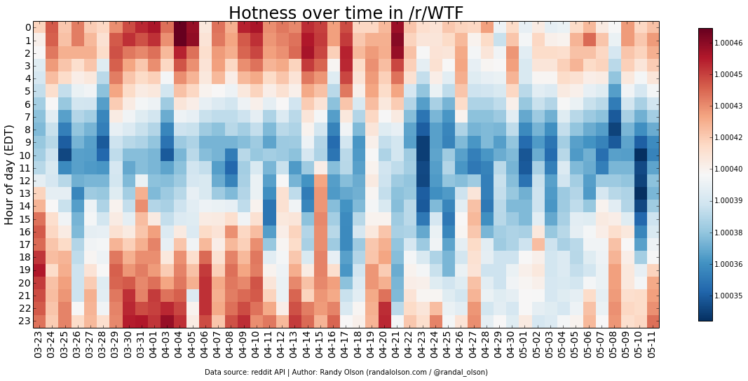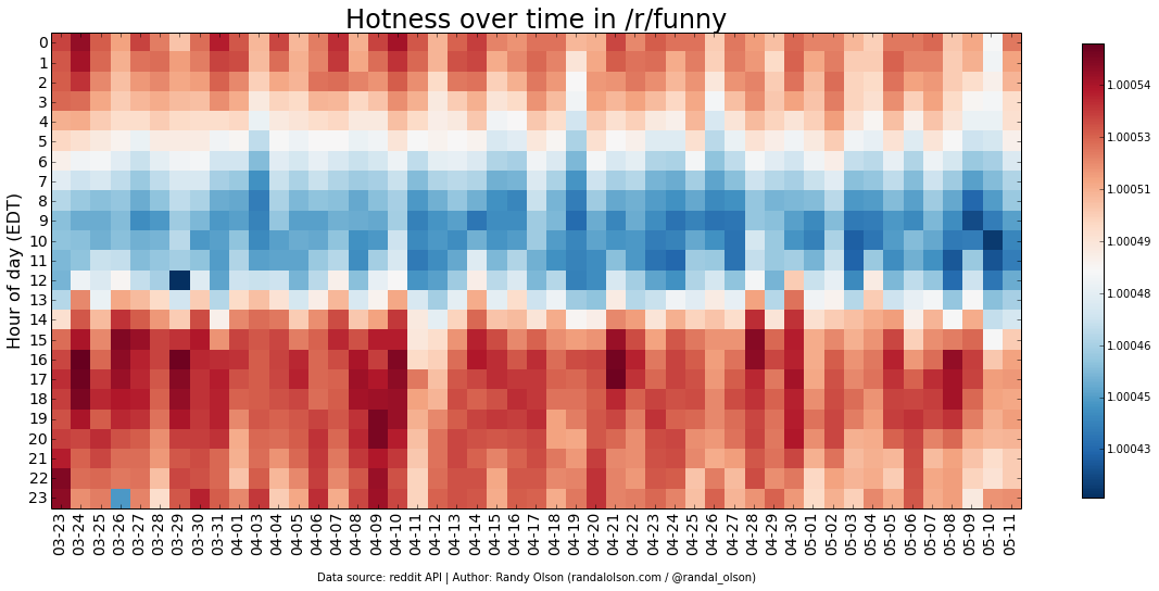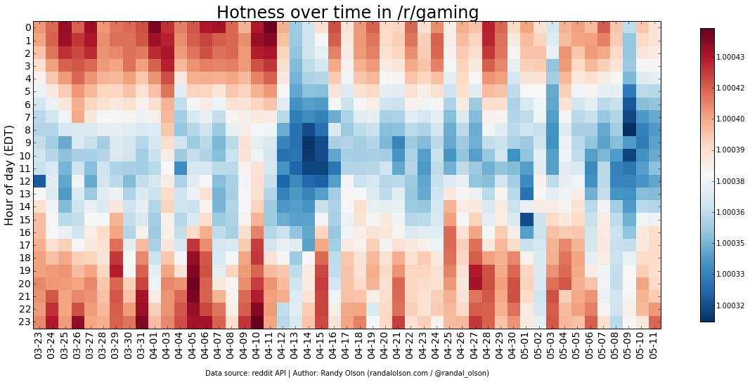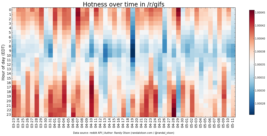 I've plotted the hotness scores by day and hour for several of the popular subreddits below.