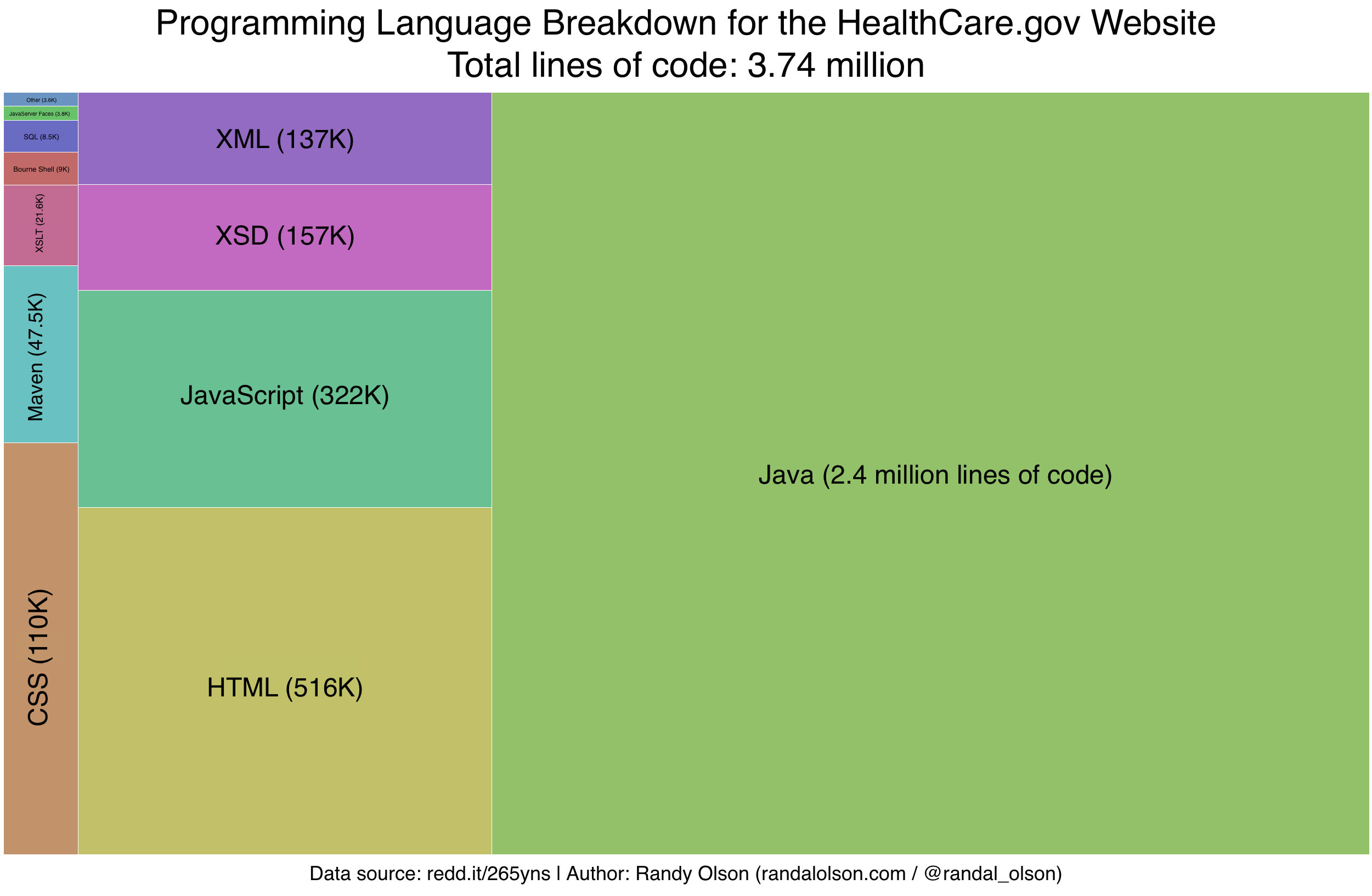 Just today, a data visualization poking fun at this statistic made it to the front page of the subreddit /r/dataisbeautiful. Apparently annoyed by this horrendously false statistic for the last time, one programmer on the HealthCare.gov software development team decided to put the statistic to rest. This programmer performed an automated code count for the HealthCare.gov code base and estimated that there it has only about 3.7 million lines of code for the primary code base. Below is the breakdown of programming languages for that 3.7 million lines of code.