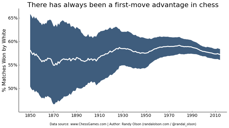 In my previous post, I discovered that the first-move advantage becomes more pronounced the more skilled the chess players are. When we look at the ratio of White:Black wins in non-drawn games over time, we find that there has always been a first-move advantage: White consistently wins 56% and Black only 44% of the games every year between 1850 and 2014.