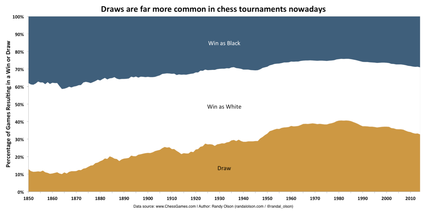 Since the early 20th century, chess experts have feared that the over-analysis of chess will lead "draw death," where experts will become so skilled at chess that it will be impossible to decisively win a game any more. The plot below seems to support their fears: Only 1 in 10 games ended in a draw in 1850, whereas 1 in 3 games ended in a draw in 2013. The small dip in draws since 1980 looks promising, but it could very well just be noise.