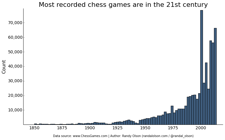 We'll start again with some diagnostics. Unsurprisingly, this data set contains far more games from the past 20 years than for the rest of time. It's becoming easier and easier to keep long-lasting records of chess games now, so we can only expect this trend to continue. Sadly, this means that many games in the 20th century and earlier are lost to us -- but we'll work with what we have. Despite these shortcomings, this data set includes many of the most famous games in chess history, including The Immortal Game and Fischer's Game of the Century.