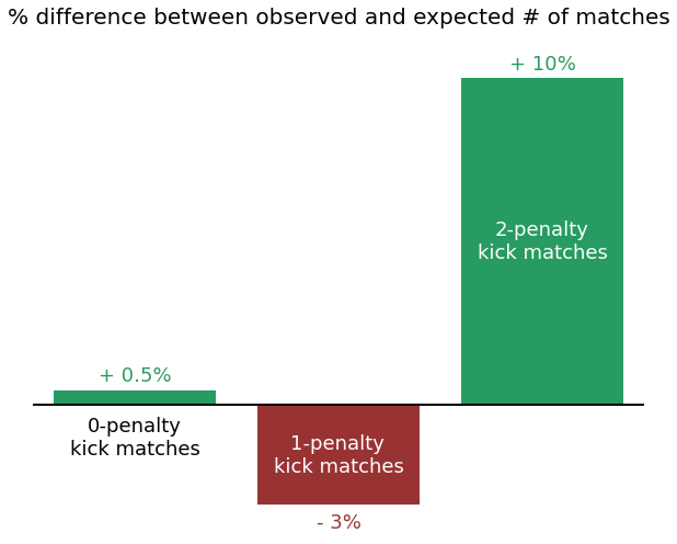 If referees awarded penalty kicks in a completely unbiased manner, we would expect the distribution of matches with penalty kicks to follow a Poisson distribution: Most matches with no penalty kicks, a good number of matches with 1 penalty kick, a handful of matches with 2 penalty kicks, and so on. Instead, Schwarz found a peculiarity in the data: There are far more 2-penalty kick matches than would be expected by chance. It appears that referees have a bias to turn some of these 1-penalty kick matches into 2-penalty kick matches.