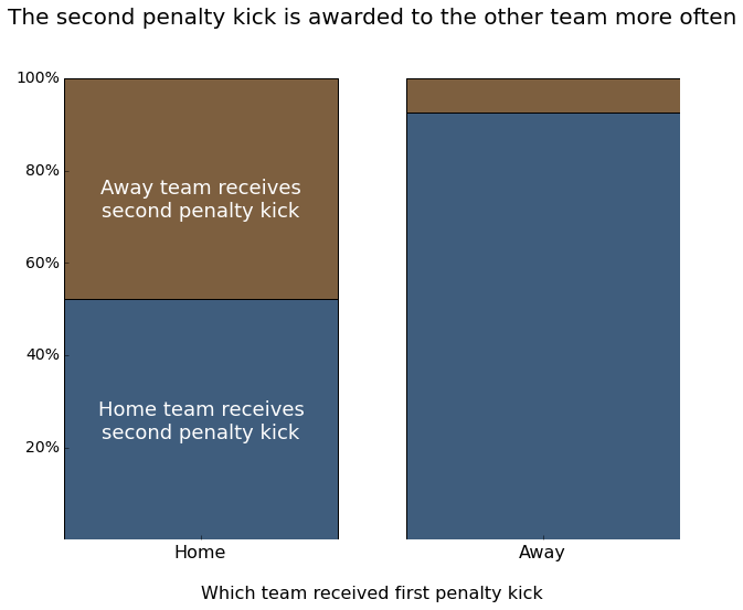 Using the above breakdown as a baseline, Schwarz then focused in on the 2-penalty kick matches to see what was going on. Could it be that referees are trying so hard to be fair to both teams that they're trying to give both teams an even number of penalty kicks? The data seems to suggest that this is the case: If the Home team received the first penalty kick, then the Away team received the second penalty kick 48% of the time -- a marked increase from the baseline 29.5%. Similarly, if the Away team received the first penalty kick, then the Home team received the second penalty kick 92.5% of the time -- an incredible display of referee bias.