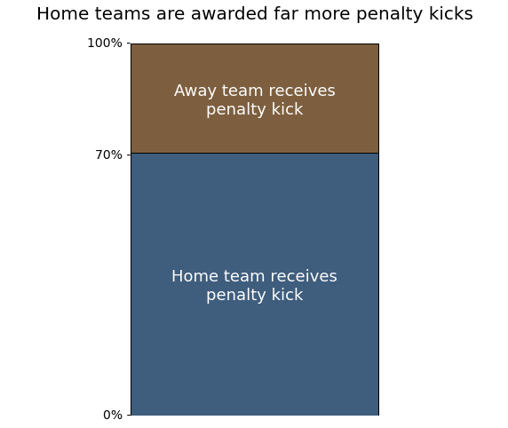To explore this question a little further, Schwarz looked at the breakdown of which teams are awarded the penalty kicks. Surprisingly, the Home team has a considerable advantage when it comes to penalty kicks: 70.6% of all penalty kicks were awarded to the Home team. So not only do Home teams have the advantage of more fans cheering them on, but it appears that the referees are on their side too.