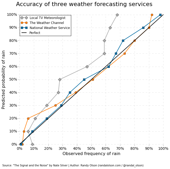 We all rely on these weather forecasts to plan our day-to-day activities. For example, before planning a summer grill out over the weekend, we'll check our favorite weather web site to see whether it's going to rain. Of course, we're always left to wonder: Just how accurate are these forecasts? Plotted below is the accuracy of three major weather forecasting services. Note that a perfect forecast means that, e.g., the service forecasted a 20% chance of rain for 40 days of the year, and exactly 8 (20%) of those days actually had rain.