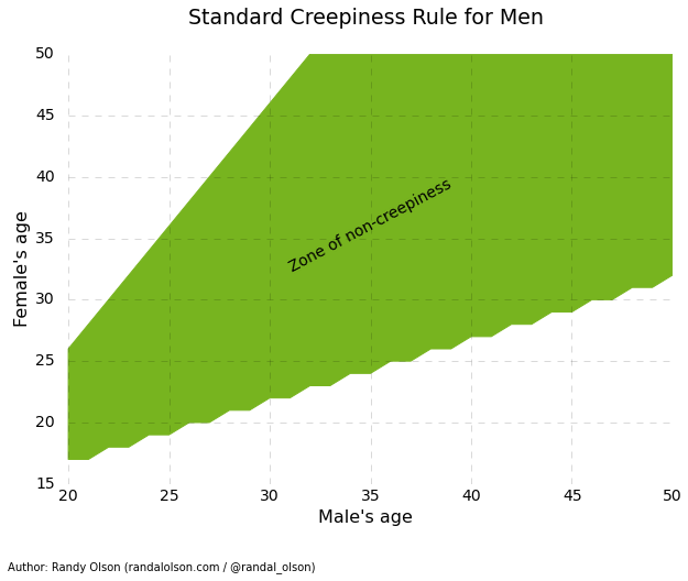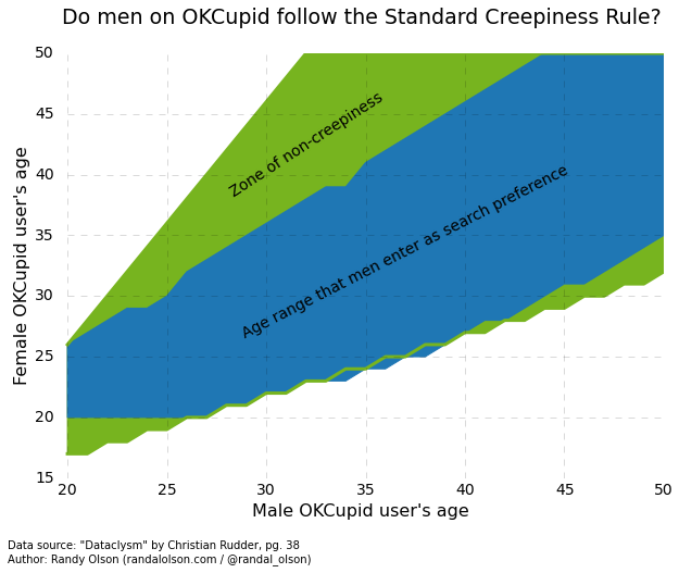 It just so happens that Christian Rudder released his book Dataclysm last week, which features a chart showing us the age range that men search on OkCupid for when looking for women to date. One of my first thoughts when I saw this chart was: Do men on OkCupid follow the Standard Creepiness Rule?