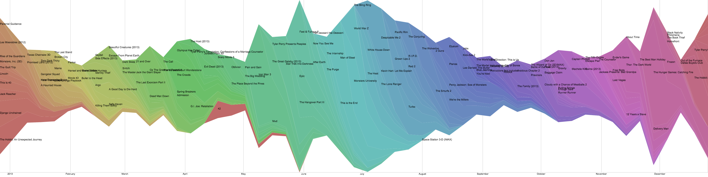 At this point, I've gathered the weekly box office sales of the top movies for the past 3 decades (1982-2014), which fits comfortably into a ~8 MB file. However, it's been surprisingly difficult to find visualization software that can visualize 3 decades of data into a streamgraph without crashing. I've had the best luck so far has been with the RAW engine, which I used to plot 5 years of box office sales (2009-2014) below.
