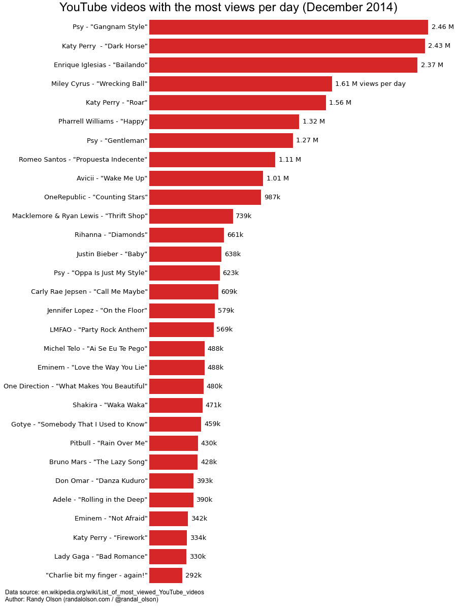 Of course, the list above slightly favors older YouTube videos like Charlie bit my finger that were posted almost a decade ago. To give a better idea of the momentum that these videos have, I sorted the top 30 videos by the average number of views they received per day since the day they were posted.