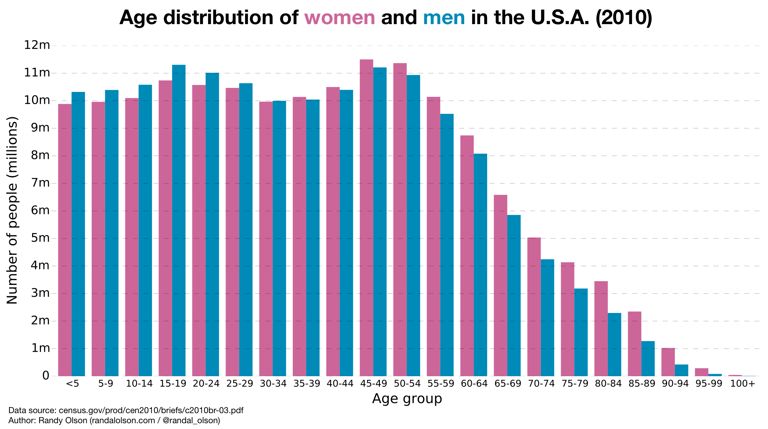 Now we have the exact same benefits of the population pyramid, with the additional benefit of being able to immediately discern whether there are more women or men in each age group. Arguably, we can now perform the same comparison between age groups as well -- for example, are there more 50-54-year-old women than 30-34-year-old men? -- but those comparisons become difficult the further the age groups are from each other.