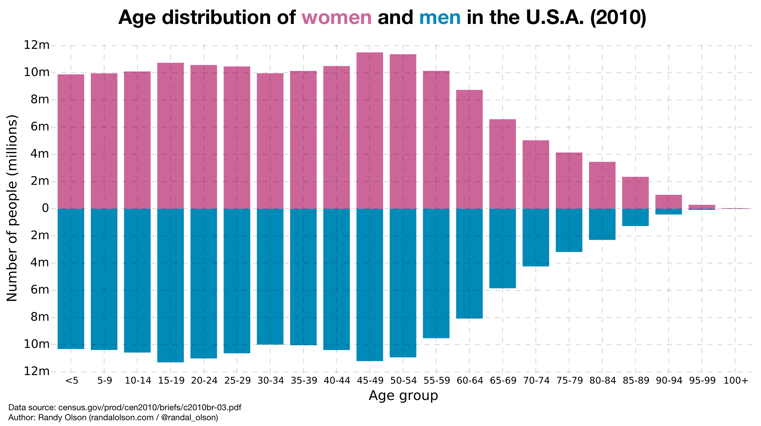 One of the most noticeable mistakes that the population pyramid makes is flipping the chart on its side to form a "pyramid" shape. I can only view this as an aesthetic flourish, since it violates one of the standard expectations of plotting: The causal variable should always be on the x-axis.
