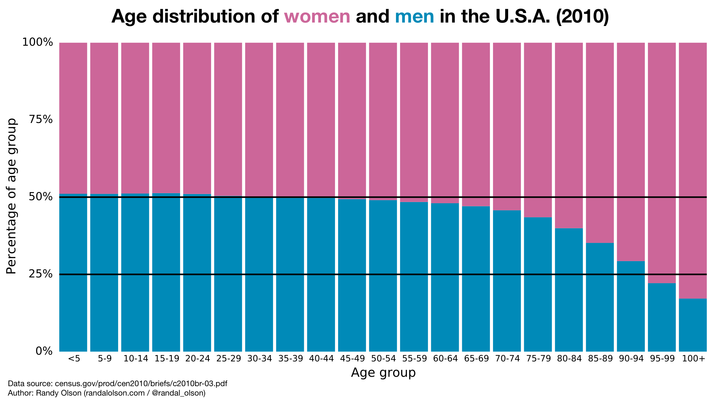 Now those trends I discussed above become abundantly clear, and we see that roughly 75% of U.S. adults aged 90+ are women. Sorry, straight men: your wife is probably going to outlive you.