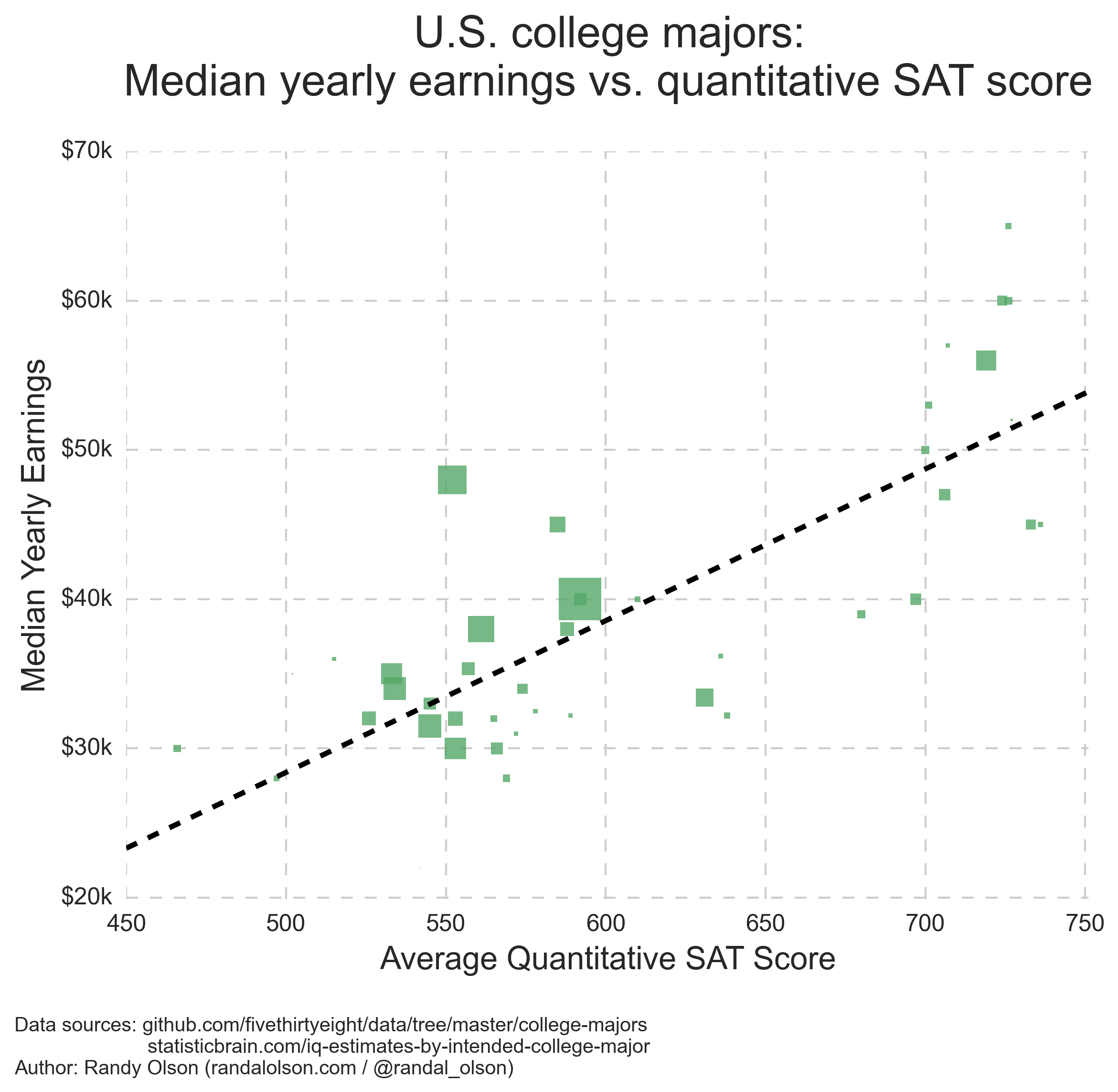 If you read my blog last year (or read the introduction to this post!), you may remember the correlation between quantitative SAT scores (and IQs) and gender ratios of college majors. What if we matched up the quantitative SAT scores -- which can be used as a proxy for how quantitatively-focused a major is -- with the median earnings for each majord?