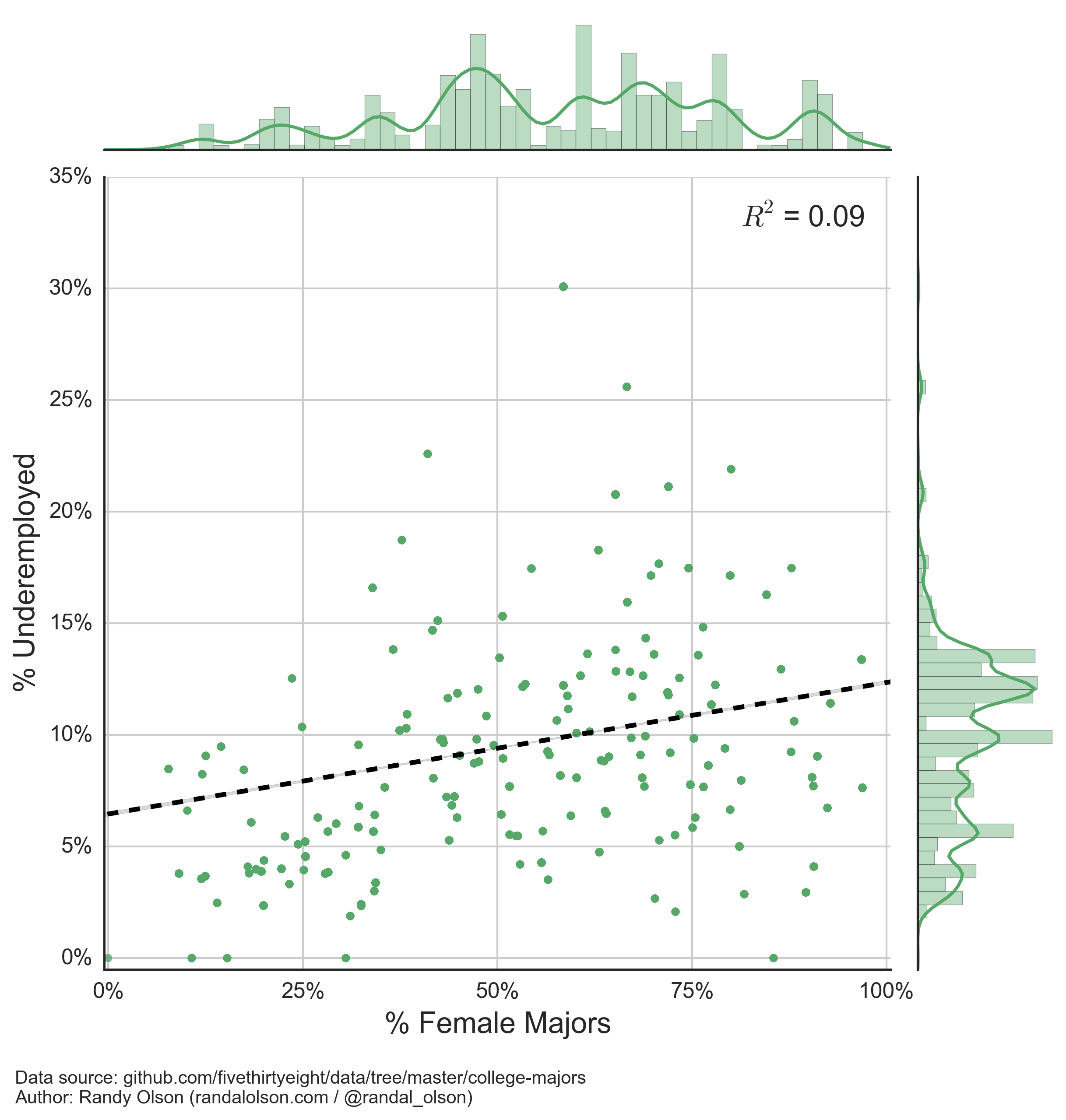 Yet again, our idea has been busted: There is only a weak correlation between the gender ratios and underemployment rates of college majors, so the typical narrative of useless college degrees doesn't seem to explain why male-dominated majors earn more than female-dominated ones.