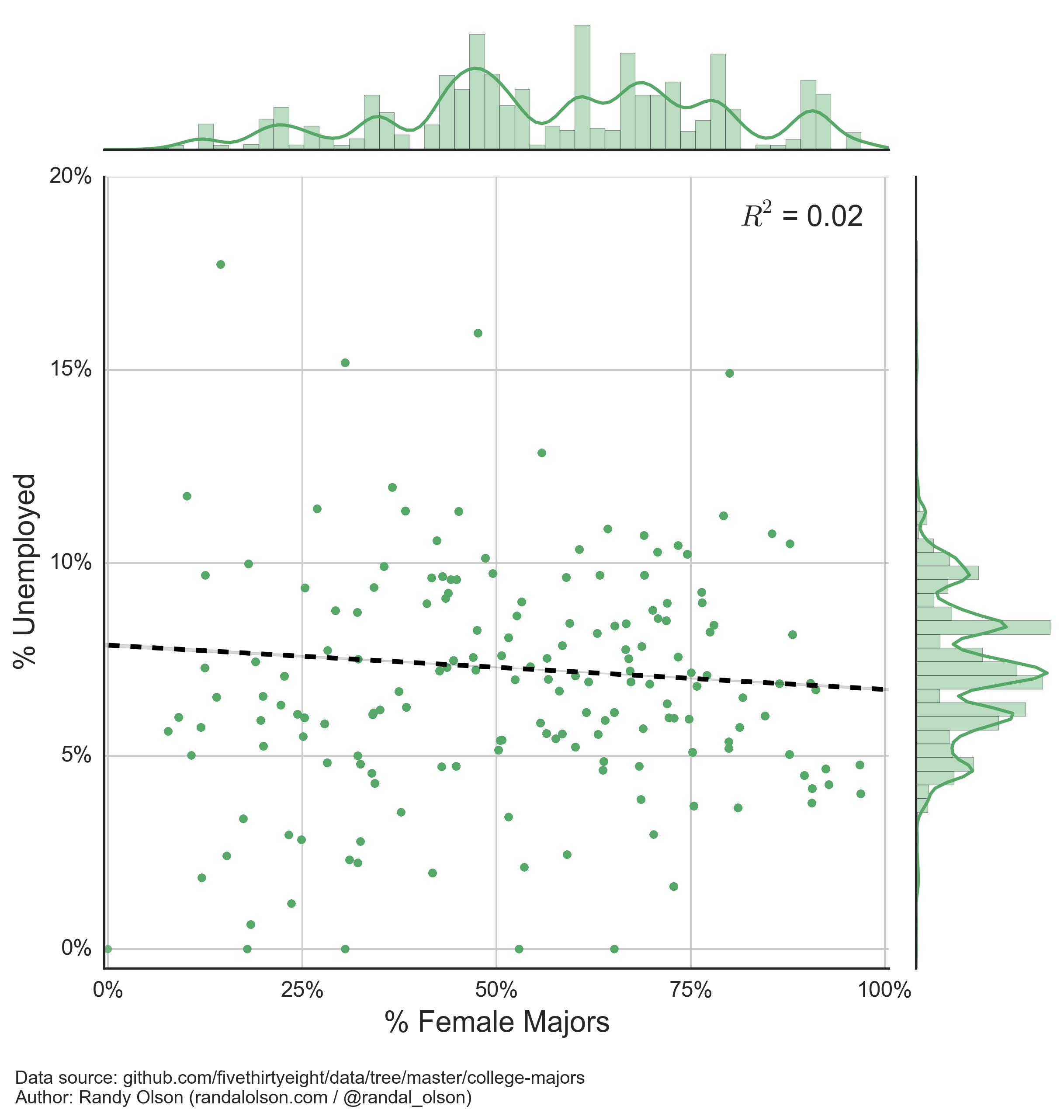 For the most part, this idea seems to be busted: There is no significant correlation between the gender ratios and unemployment rates of college majors, and most majors are sitting around the national unemployment rate of 5.5%.