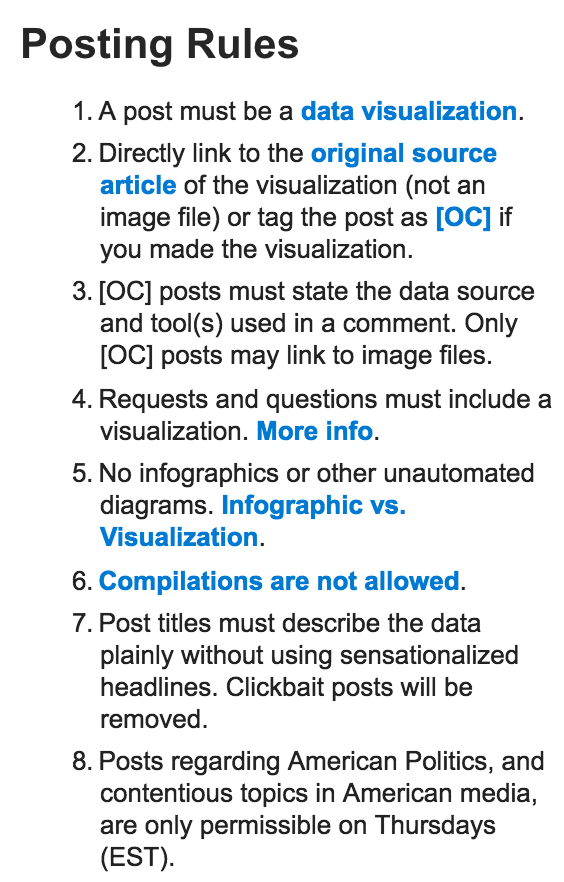 /r/DataIsBeautiful currently has five core posting rules (1-5), and three experimental rules (6-8):