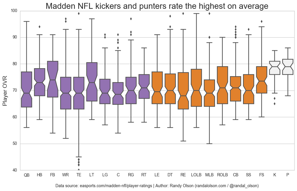 Madden player OVRs range from 40 (worst) to 99 (best), with a majority of the players falling between 65 and 75 OVR. Only a handful of players fall into the coveted 99 rating spot, which include current NFL greats such as Patriots TE Rob Gronkowski (when he's healthy) and Broncos linebacker Von Miller (the highest paid defensive player in NFL history). There's an interesting blip of players in the low-40s OVR range, which are better highlighted when we break down the OVRs by position: