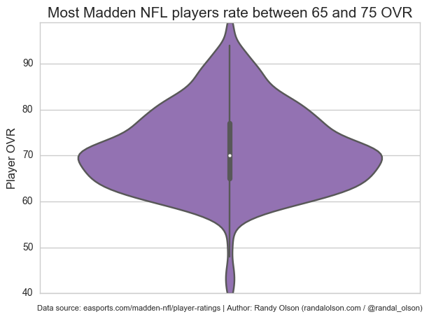 Since no analysis is complete without some basic exploratory data analysis, let's take a look at the distribution of overall player ratings, which is what we're looking to model. The chart below is a violin plot, which is a combination of a box plot and histogram. Basically, it shows the distribution of Madden player OVRs.